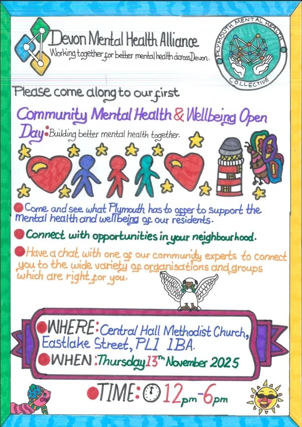On Thursday 13th November, the Devon Mental Health Alliance banded together with the Plymouth Mental Health Collective to host the first Community Mental Health & Wellbeing Open Day in Plymouth. Set up in the Plymouth Methodist Central Hall in the city centre, the event invited local mental health organisations to open the doors to the public, bringing services and support closer to the community.