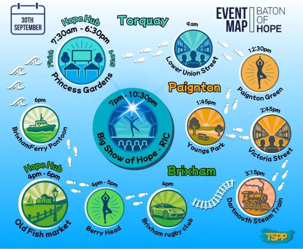 The Baton will start at the Torquay Hope Hub (which will have a live tour screen, entertainment, refreshments and wellbeing related stalls) in Princess Gardens and will travel through Paignton and Brixham.